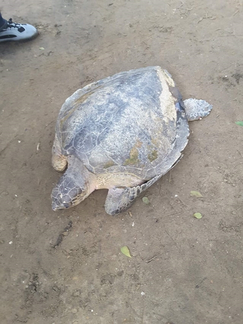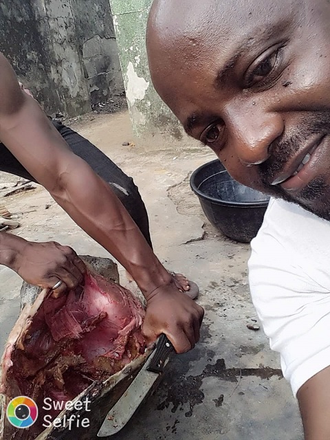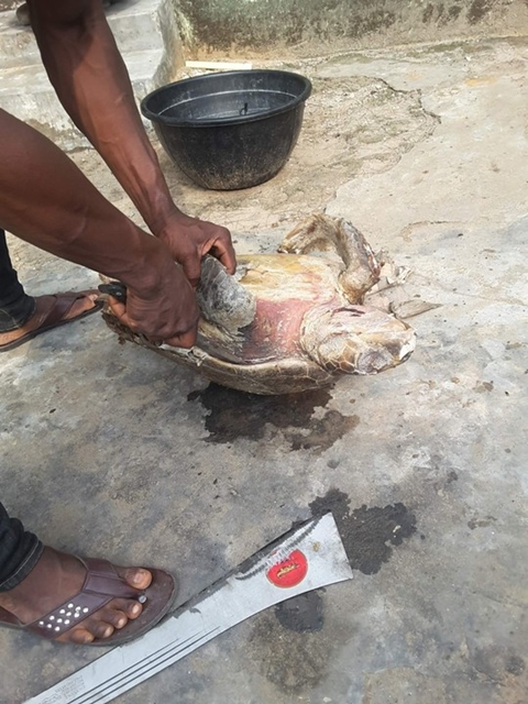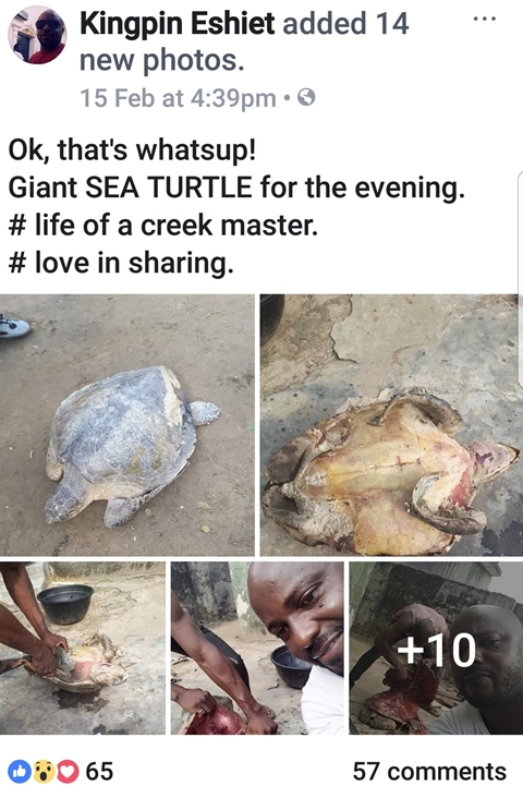 A Facebook user identified as Kingpin Eshiet, has taken to the social networking platform to share some photos of him and a friend slaughtering a giant sea turtle to make a meal.