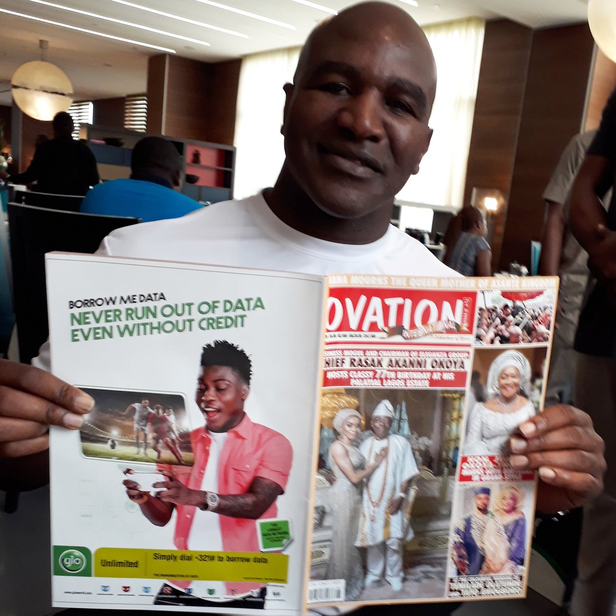 | Evander Holyfield holding Ovation Magazine |