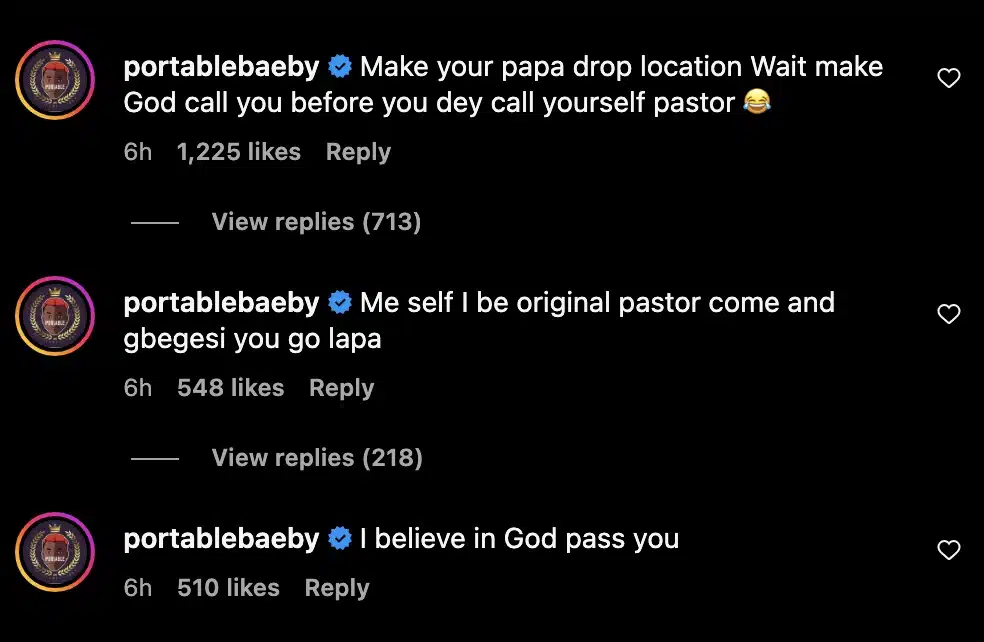 In response, Portable took to the comment section of the post, daring the pastor to drop the address of his church for a fight.