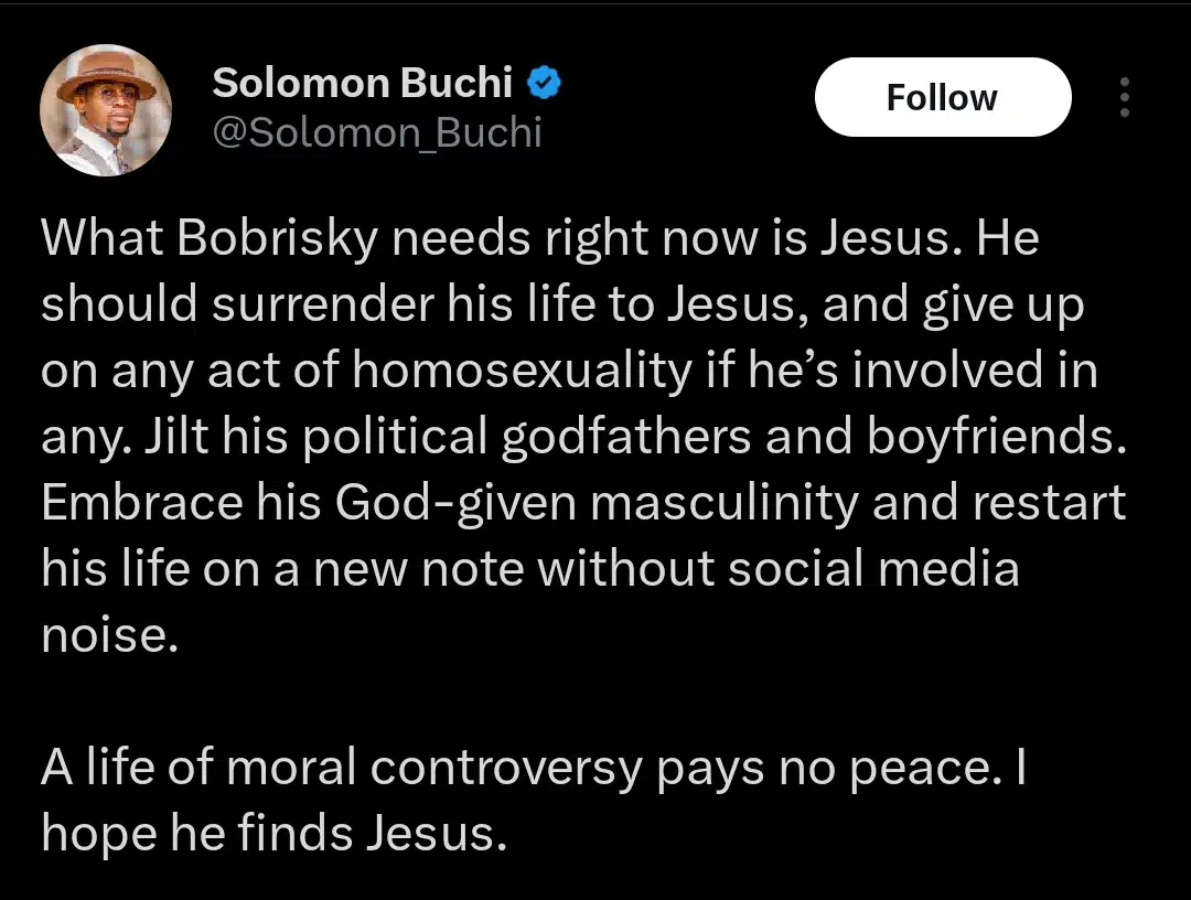 “What Bobrisky needs right now is Jesus. He should surrender his life to Jesus and give up any involvement in homosexuality if he’s engaged in such. Break ties with political godfathers and boyfriends. Embrace his God-given masculinity and begin a new chapter without social media noise.”